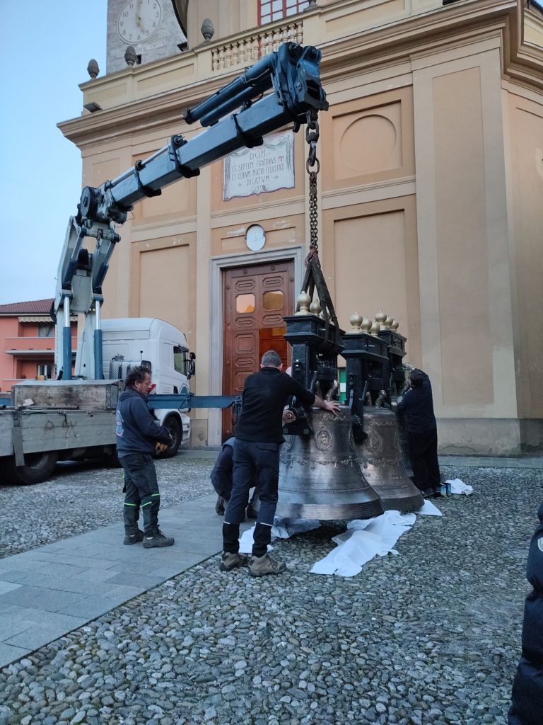 Dopo mesi di restauro, riecco le amate campane. Prima che venissero montate nella cella campanario lunedì 20 marzo, le campane sono state per due giorni sul sagrato della chiesa, rappresentando un’occasione unica per la popolazione per vederle da vicino. Il momento è stato significativo per tutte le età, grandi e piccini hanno fotografato, toccato e ammirato divertiti le oltre 22 tonnellate di metallo appoggiate al suolo.