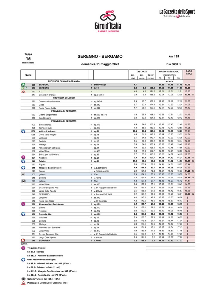 Un percorso che promette grandi emozioni quello della quindicesima tappa del Giro 2023 con arrivo nel centro città. Considerata dagli organizzatori di RCS Sport “tappa di montagna”, la frazione di domenica 21 maggio mostra un profilo capace di esaltare le qualità di qualche scalatore. La prima salita è al Valico di Valcava dopo 36 chilometri dal via, da qui la discesa verso Villa d’Alme e il passaggio da Nembro per la seconda salita di giornata: il Selvino, l’ascesa iconica dei ciclisti bergamaschi. La successiva discesa verso la val Brembana porterà i “girini” ad avvicinarsi per la prima volta a Bergamo con il passaggio in Città Alta, e da qui il gruppo proseguirà verso l’ascesa alla Roncola e a Valpiana. Infine, giù in discesa fino ad avvicinarsi alla città di Bergamo con un secondo passaggio in Colle Aperto, preludio del traguardo sul Sentierone.