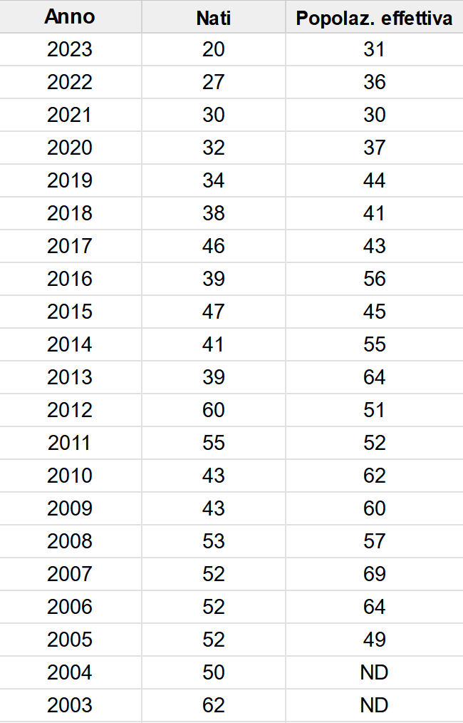 Nel 2023 solo 20 fiocchi appesi alle porte dei ranichesi: è questo il triste dato che conferma un trend ormai in costante regressione e che riguarda tutto il nostro paese, ultimo nell’UE per tasso di natalità. Il nostro comune nell’anno appena trascorso ha registrato un tasso da record (negativo) pari a 3,3 bambini nati su mille abitanti, un dato largamente sotto la media italiana (7‰) ed europea (9‰).