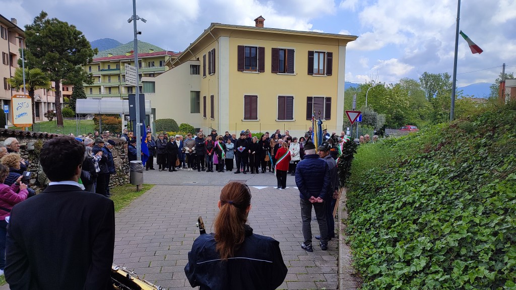 Il paese di Ranica non si è certo risparmiato dalle celebrazioni: dopo la messa delle 9.30, il corteo di persone – guidato dalle note del Corpo Musicale P. Pelliccioli e dalle rappresentanze di amministrazione e associazioni, si è diretto presso il Passaggio Sciopero di Ranica, per intenderci il viale della biblioteca. Qui, è stata depositata una nuova pietra d’inciampo in memoria di Antonio Morotti, ranichese deportato e morto nei lager nazisti del Secondo conflitto mondiale. Il momento, cominciato dall’Inno d’Italia, è stato molto toccante: il sindaco ha celebrato l’evento non nascondendo l’emozione: “Abbiamo posto la pietra in questo luogo molto significativo per la nostra Comunità, all’inizio di questo passaggio, attraversato da molte persone di età diverse per raggiungere il centro del paese, luoghi, laboratori di educazione, aggregazione, relazione , cura, presupposti di libertà e che possiamo vivere grazie alla libertà che ci è stata consegnata.”
